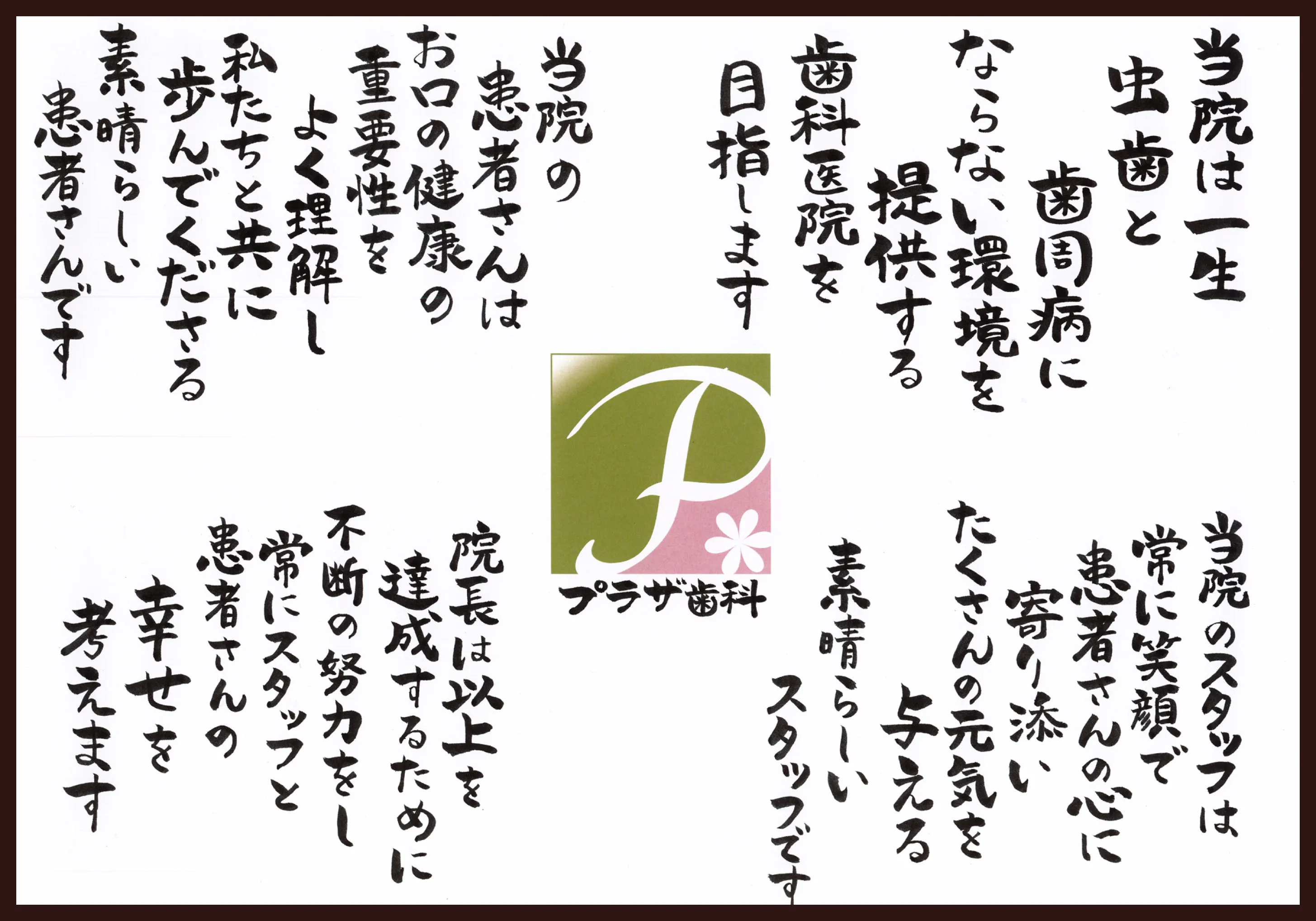 人も同じです。だからこそ歯は、どんな状況にあっても充分な注意と管理を受けるだけの価値を持っています。1人でも多くの方に歯の大切さをわかっていただき、共にお口の健康を守り、生き生きと人生を楽しんでいただくことが私たちの願いです。